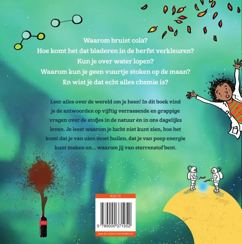Hoe komt het dat bladeren in de herfst van kleur veranderen? Kun je over water lopen? En wist je dat we allemaal uit sterrenstof bestaan? Gezondheidswetenschapper Esther Walraven brengt een nieuw weetjesboek, ditmaal rond het thema scheikunde. Ze bespreekt in korte hoofdstukken vijftig verschillende onderwerpen die te maken hebben met ‘stofjes in de natuur en in ons dagelijks leven’, op de vlotte, heldere manier die we van haar gewend zijn. Een boek over scheikunde is natuurlijk niet compleet zonder de nodige experimenten en proefjes. En als kers op de taart maakte Iris Boter de vrolijke, grappige illustraties.