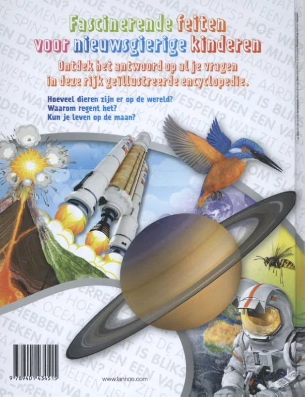 Duidelijke antwoorden op heel wat moeilijke vragen van kinderen Waarom? Waarom? Kinderen vragen het voortdurend. Dit boek geeft nieuwsgierige aagjes het antwoord op de vaakst gestelde vragen. Hoeveel dieren zijn er op de wereld? Waarom regent het? Kun je leven op de maan? Een volledig naslagwerk voor kinderen vanaf acht jaar over de ruimte, de aarde, planten en dieren, geschiedenis, wetenschap en het menselijk lichaam.