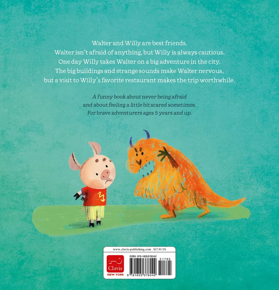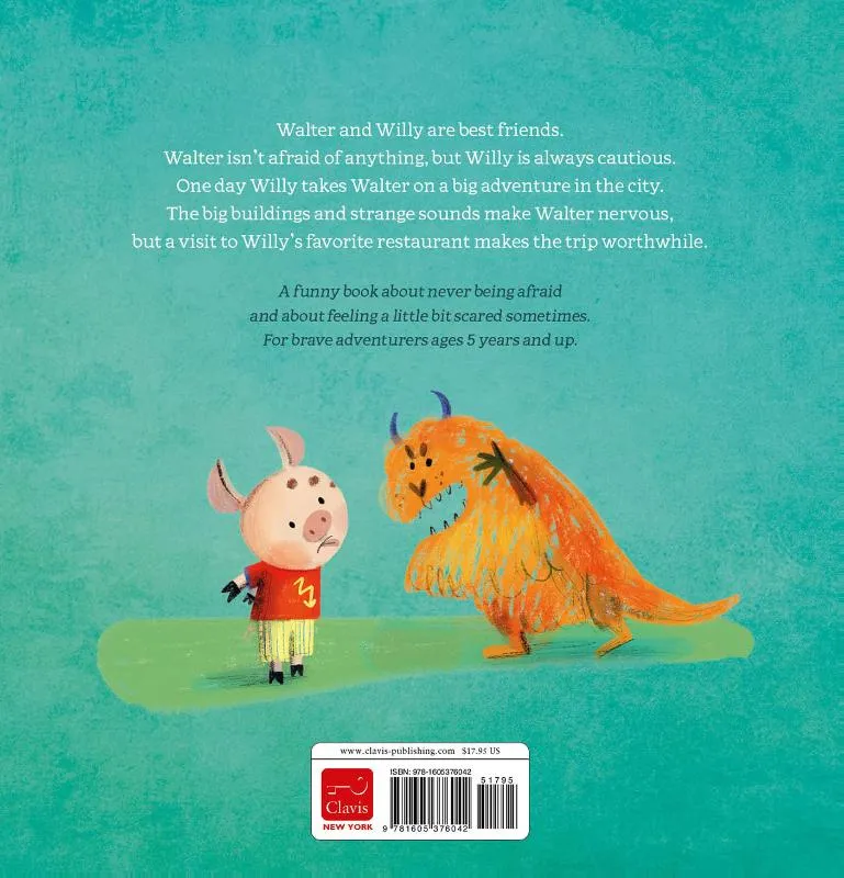 Walter and Willy are best friends. Willy isn’t afraid of anything, but Walter is always cautious. One day Willy takes Walter on a big adventure in the city. The big buildings and strange sounds make Walter nervous, but a visit to Willy’s favorite restaurant makes the trip worthwhile.