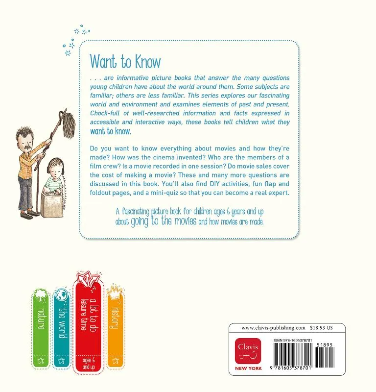 Hoe worden films gemaakt en wie heeft de film uitgevonden? Prentenboek met allerlei informatie over de film, uitleg over het knutselen van een thaumatroop, quiz, een uitklappagina en veel getekende kleurenillustraties. Voorlezen vanaf ca. 8 jaar, zelf lezen vanaf ca. 9 jaar.