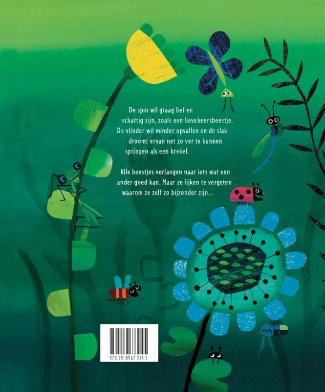 De spin zou graag lief en schattig zijn, zoals een lieveheersbeestje. De vlinder wil minder opvallen en de slak droomt ervan net zo ver te kunnen springen als een krekel.