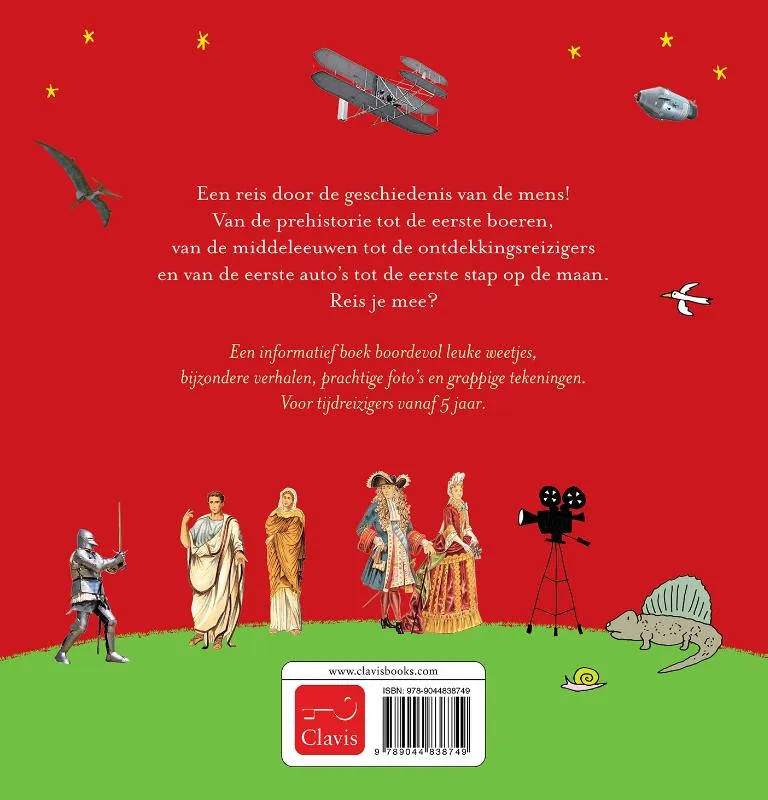 Een reis door de geschiedenis van de mens! Van de prehistorie tot de eerste boeren, van de middeleeuwen tot de ontdekkingsreizigers en van de eerste auto’s tot de eerste stap op de maan. Reis je mee?