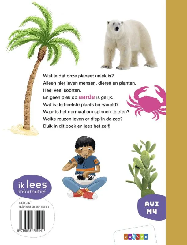 Er valt zoveel te ontdekken over onze unieke, blauwe planeet. En daar helpt dit interessante boek uit de serie ik lees informatief op AVI M4-niveau bij. Ga mee op reis in Wat een wereld! en ontdek bijzondere plaatsen, unieke dieren en eigenaardige gewoontes.