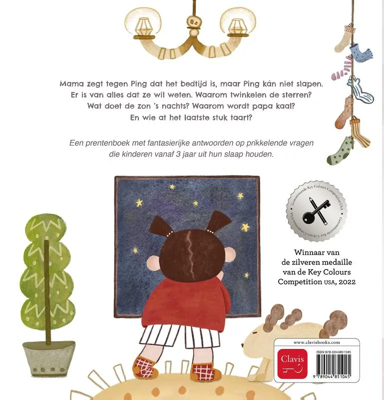 Mama zegt tegen Ping dat het bedtijd is, maar Ping kán niet slapen. Er is van alles dat ze wil weten. Waarom twinkelen de sterren? Wat doet de zon ’s nachts? Waarom wordt papa kaal? En wie at het laatste stuk taart? Een prentenboek met fantasierijke antwoorden op prikkelende vragen die kinderen vanaf 3 jaar uit hun slaap houden.