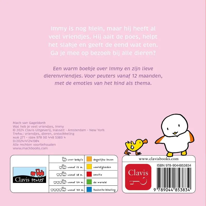 Een warm boekje over Immy en zijn lieve dierenvriendjes. Voor peuters vanaf 12 maanden, met de emoties van het kind als thema.