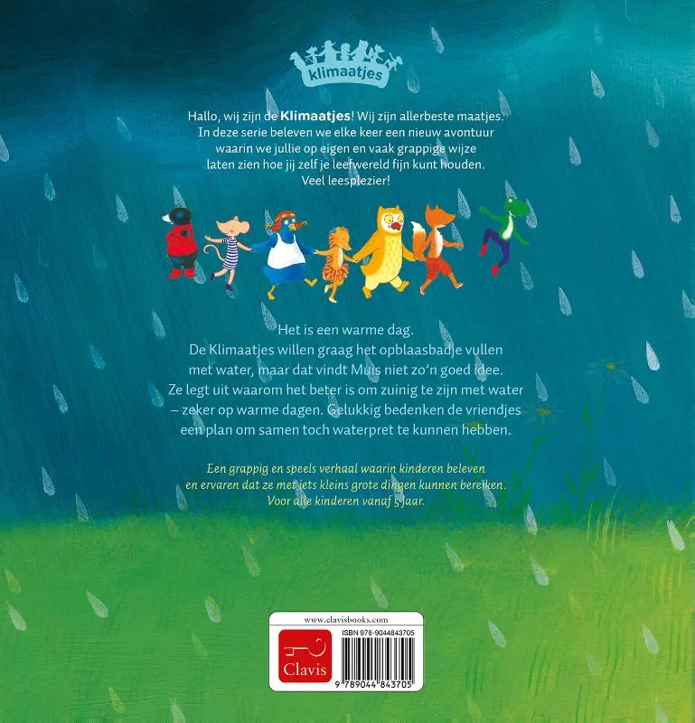 Het is een warme dag. De Klimaatjes willen graag het opblaasbadje vullen met water, maar dat vindt Muis niet zo’n goed idee. Ze legt uit waarom het beter is om zuinig te zijn met water – zeker op warme dagen. Gelukkig bedenken de vriendjes