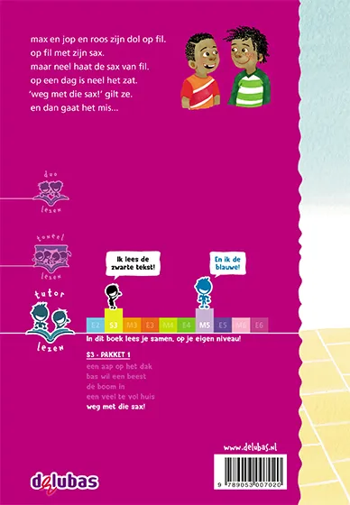 Weg met die sax! is een van de vijf boeken uit het S3 pakket 1 tutorlezen van Uitgeverij Delubas, speciaal ontwikkeld voor tutorlezen, met S3 als leesniveau voor de beginnende of zwakkere lezer.