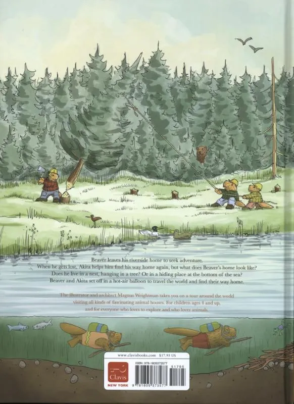 Bever trekt de wereld in. Hij belandt in de stad, maar hoe komt hij weer thuis? Gelukkig mag hij met Akita de hond mee in zijn luchtballon rond de wereld. Op zoek naar Bevers huis zien ze hoe andere dieren wonen. Groot prentenboek met gedetailleerde, sfeervolle kleurentekeningen. Vanaf ca. 4 jaar.