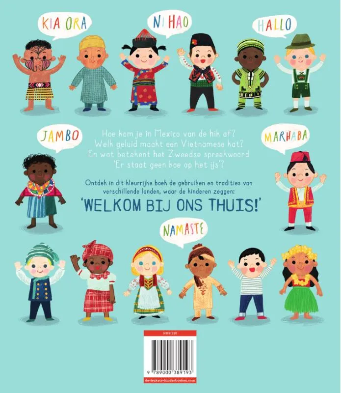 Welk geluid maakt een Vietnamese kat? En wat betekent het Zweedse spreekwoord ‘Er staat geen koe op het ijs’? Ontdek alles – de verschillen, maar ook de overeenkomsten – over het leven van kinderen in andere landen in Welkom bij ons thuis. Lees samen met je kleuter met welk speelgoed kinderen van Nepal tot Mexico spelen, of leer een traditioneel Ghanees spelletje voor op het schoolplein. En als het uit is? Dan zeg je Arrivederci – in Italië tenminste!