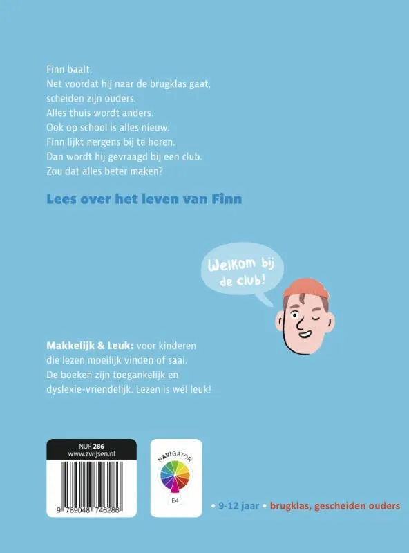 Ga je eindelijk naar de brugklas, vertellen je ouders je dat ze gaan scheiden. Nóg meer veranderingen in je leven, heftig. Lees hoe Finn hiermee omgaat. Zou de club kinderen van gescheiden ouders alles makkelijker maken? Of juist niet … Herkenbaar verhaal op AVI E4 voor kinderen van 9-12 jaar in de serie ‘Makkelijk & Leuk’, speciaal voor kinderen die lezen moeilijk vinden of saai. Zo krijgen zij weer plezier in lezen. Dyslexievriendelijk!<br><br>Finn baalt. <br>Net voor hij naar de brugklas gaat, <br>scheiden zijn ouders. <br>Alles thuis wordt anders. <br>Ook op school is alles nieuw. <br>Finn lijkt nergens bij te horen. <br>Dan wordt hij gevraagd bij een club. <br>Zou dat alles beter maken?