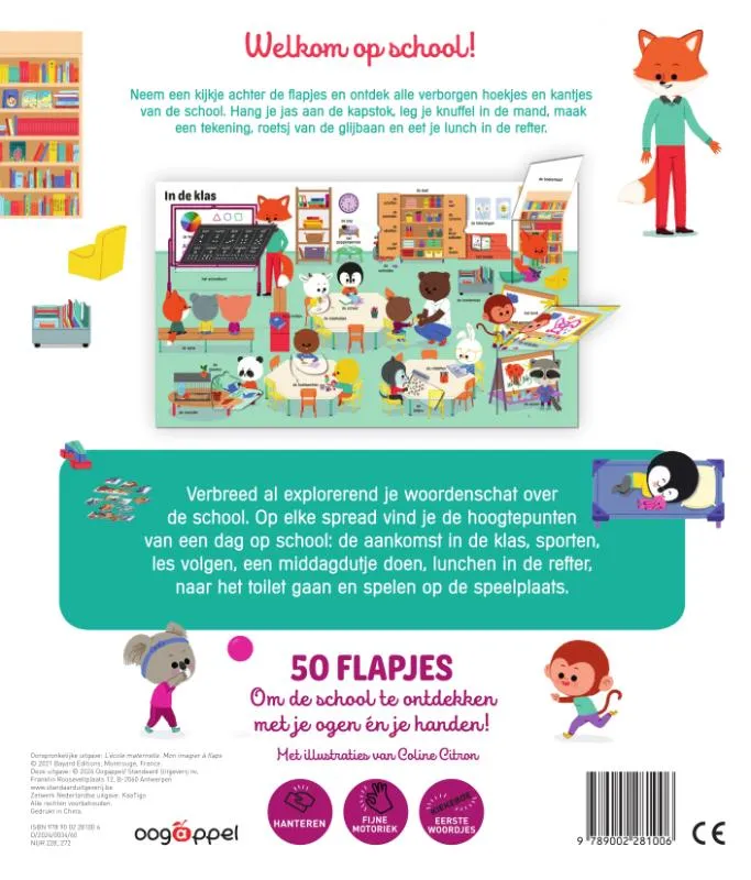 Neem een kijkje achter de flapjes en ontdek alle verborgen hoekjes en kantjes van de school. Hang je jas aan de kapstok, leg je knuffel in de mand, maak een tekening, roetsj van de glijbaan en eet je lunch in de refter.
