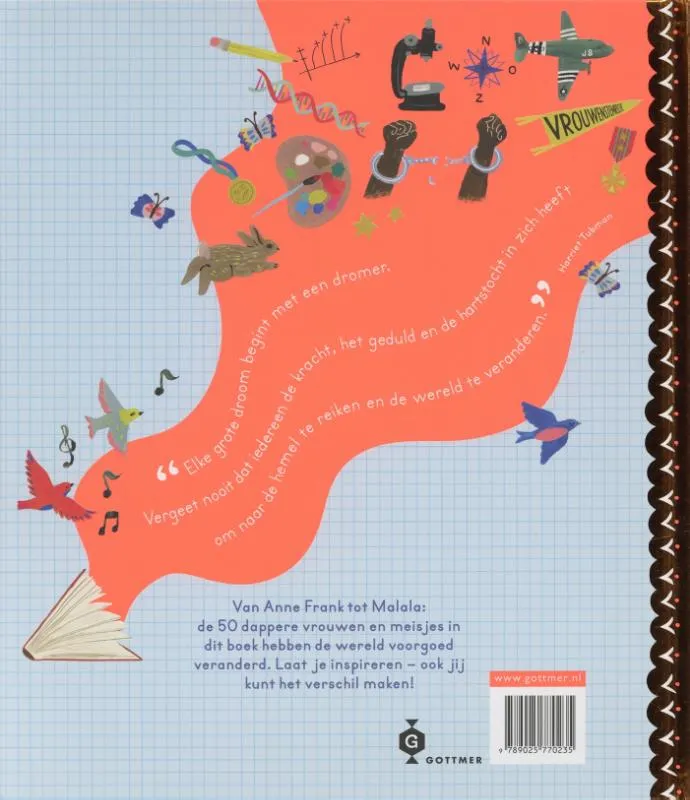 Jeanne d’Arc, Beatrix Potter, Coco Chanel, Anna Pavlova, Marie Curie, Moeder Teresa, Amelia Earhart, Rosa Parks, Anne Frank… In ‘Wereldvrouwen’ vind je de levensverhalen van 50 bekende en minder bekende vrouwen van over de hele wereld. Er zitten astronauten tussen, muzikanten, wiskundigen en schrijvers, en allemaal volgen we ze vanaf hun jeugd tot aan hun droom om de wereld wat mooier te maken.