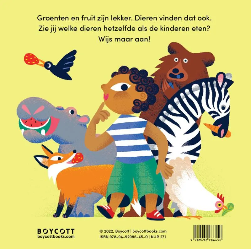 In dit kartonboekje leer je niet alleen groenten en fruit herkennen, maar ook verschillende dieren en wat zij eten. Met deze kennis wordt eten nog leuker!