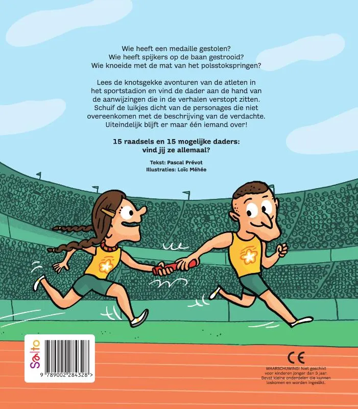 Wie heeft een medaille gestolen?Wie heeft spijkers op de baan gestrooid?Wie knoeide met de mat van het polsstokspringen?Lees de knotsgekke avonturen van de atleten in het sportstadion en vind de dader aan de hand van de aanwijzingen die in de verhalen verstopt zitten.Schuif de luikjes dicht van de personages die niet overeenkomen met de beschrijving van de verdachte.Uiteindelijk blijft er maar één iemand over!15 raadsels en 15 mogelijke daders: vind jij ze allemaal?