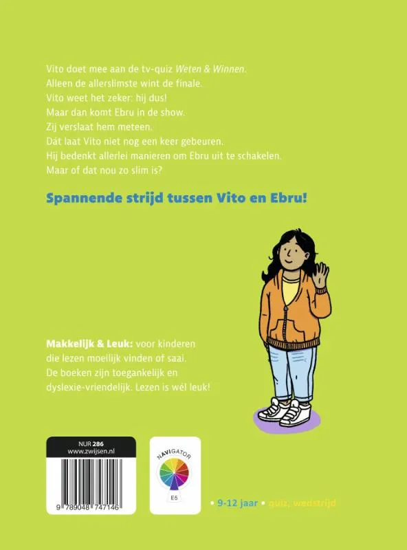 Wie wint de quiz ‘Weet en Win’? Vito natuurlijk! Hij is toch de slimste? De eerste rondes gaat hij ruim aan kop, totdat Ebru in de show komt. Weet zij meer dan hij? Dat zal toch zeker niet? Vito laat het er niet bij zitten en bedenkt slinkse manier om Ebru dwars te zitten. Dit moderne, aansprekende boek op AVI E5 is voor kinderen van 9-12 jaar in de serie ‘Makkelijk & Leuk’, speciaal voor kinderen die lezen moeilijk vinden of saai. Zo krijgen zij weer plezier in lezen. Dyslexievriendelijk!<br><br>Vito doet mee met de quiz ‘Weet en Win’.<br>De slimste wint in de finale de hoofdprijs.<br>Vito weet het zeker: die prijs is voor hem.<br>Want niemand weet meer dan hij.<br>Maar dan komt Ebru in de show.<br>Zij verslaat hem meteen.<br>Dát laat Vito niet nog een keer gebeuren.<br>Hij bedenkt allerlei manieren om Ebru dwars te zitten.<br>Maar of dat nou zo slim is?