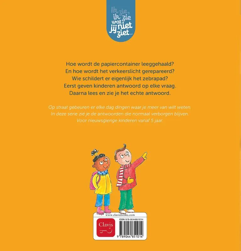 Hoe wordt de papiercontainer leeggehaald? En hoe wordt het verkeerslicht gerepareerd? Wie schildert er eigenlijk het zebrapad? Eerst geven kinderen antwoord op elke vraag. Daarna lees en zie je het echte antwoord. In de stad gebeuren er elke dag dingen waar je meer van wilt weten. In deze serie zié je de antwoorden die normaal verborgen blijven. Voor nieuwsgierige kinderen vanaf 5 jaar.