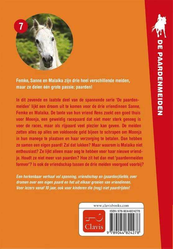 In dit zevende en laatste deel van de spannende serie ‘De paardenmeiden’ lijkt een droom uit te komen voor de drie vriendinnen Sanne, Femke en Malaika. De tante van hun vriend Rens zoekt een goed thuis voor Moonja, een geweldig racepaard dat niet meer sterk genoeg is voor de races, maar als rijpaard veel plezier kan geven. De meiden zetten alles op alles om voldoende geld bijeen te schrapen om Moonja in hun manege te plaatsen en haar verzorging te betalen. Dan hebben ze samen een eigen paard! Zal dat lukken? Maar waarom is Malaika niet enthousiast? Ze lijkt alleen maar oog te hebben voor haar nieuwe vriendje. Houdt ze niet meer van paarden? Hoe zit het dan met ‘paardenmeiden forever’? Is ook de vriendschap tussen de drie meiden voorgoed voorbij?
