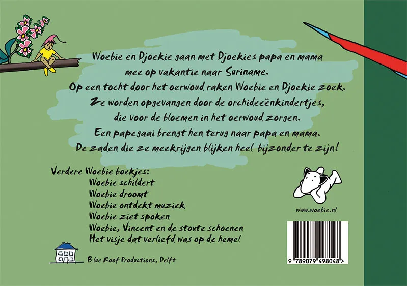 Prentenboekje over het verdwalen van Woebie en Djoekie in het tropisch regenwoud van Suriname, hun redding door onbekende oerwoudbewoners en de ontdekking van een nieuwe plantensoort.