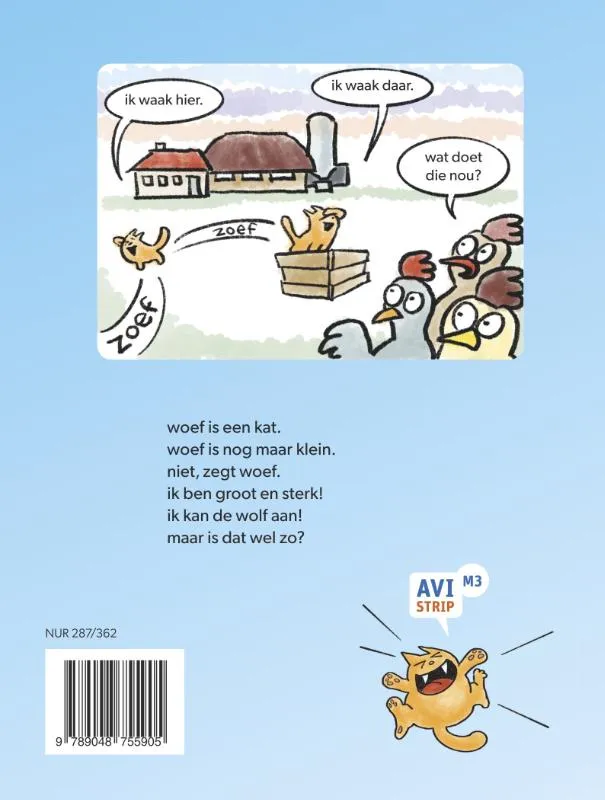Woef de kat denkt dat hij een stoere hond is en zelfs een wolf aan kan. Als dat maar goed gaat … Vrolijke strip op AVI M3 voor beginnende lezers.