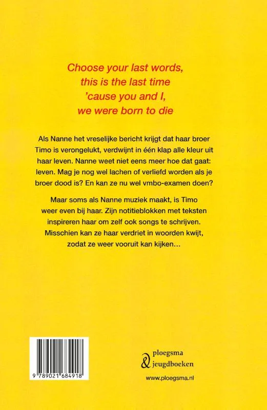 Als Nanne het vreselijke bericht krijgt dat haar broer Timo is verongelukt, verdwijnt in één klap alle kleur uit haar leven. Nanne weet niet eens meer hoe dat gaat: leven. Mag je nog wel lachen of verliefd worden als je broer dood is? En kan ze nu wel vmbo-examen doen? Maar soms als Nanne muziek maakt, is Timo weer even bij haar. Zijn notitieblokken met teksten inspireren haar om zelf ook songs te schrijven. Misschien kan ze haar verdriet in woorden kwijt, zodat ze weer vooruit kan kijken… ‘Woorden van Timo’ van Tialda Hoogeveen is een aangrijpend boek over rouw en vriendschap, op de tonen van muziek en songteksten.