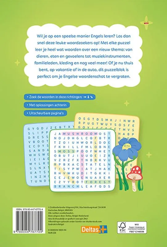Wil je op een speelse manier Engels leren? Los dan snel deze leuke woordzoekers op! Met elke puzzel leer je heel wat woorden over een nieuw thema: van dieren, eten en gevoelens tot muziekinstrumenten, familieleden, kleding en nog veel meer! Of je nu thuis bent, op vakantie of in de auto, dit puzzelblok met uitscheurbare pagina’s is perfect om je Engelse woordenschat te vergroten.