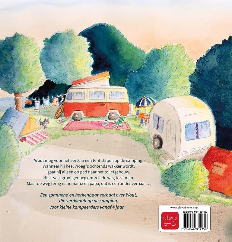 Wout mag voor het eerst in een tent slapen op de camping. Wanneer hij heel vroeg ’s ochtends wakker wordt, gaat hij alleen op pad naar het toiletgebouw. Hij is vast groot genoeg om zelf de weg te vinden. Maar de weg terug naar mama en papa, dat is een ander verhaal … Een spannend en herkenbaar verhaal over Wout, die verdwaalt op de camping. Voor kleine kampeerders vanaf 4 jaar.