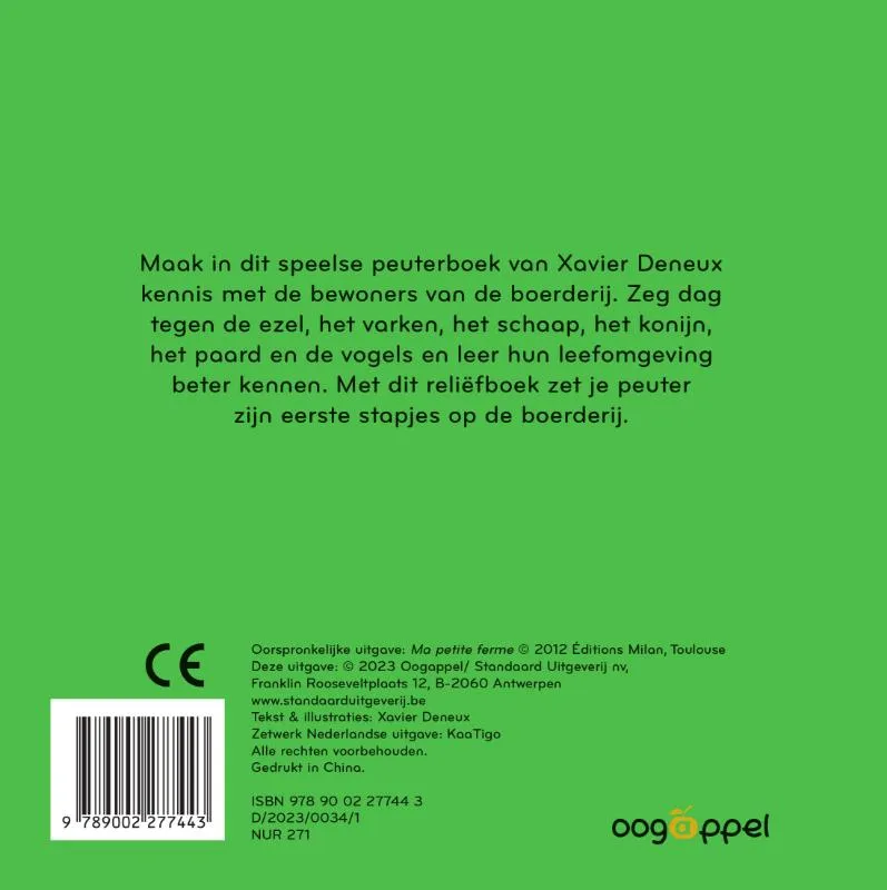 Maak in dit speelse peuterboek van Xavier Deneux kennis met de bewoners van de boerderij. Zeg dag tegen de ezel, het varken, het schaap, het konijn, het paard en de vogels en leer hun leefomgeving beter kennen. Met dit reliëfboek zet je peuter zijn eerste stapjes op de boerderij.