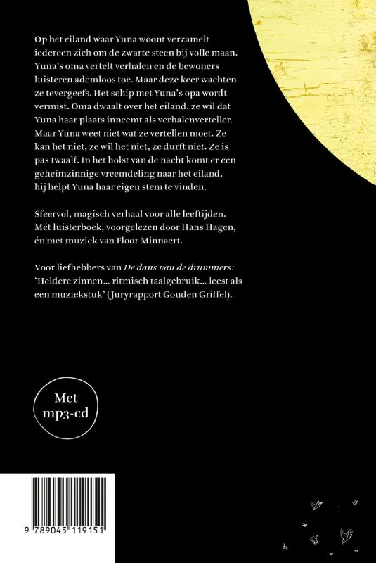 Op het eiland waar Yuna woont verzamelt iedereen zich om de zwarte steen bij volle maan. Yuna’s oma vertelt verhalen en de bewoners luisteren ademloos toe. Maar deze keer wachten ze tevergeefs. Het schip met Yuna’s opa wordt vermist. Oma dwaalt over het eiland, ze wil dat Yuna haar plaats inneemt als verhalenverteller. Maar Yuna weet niet wat ze vertellen moet. Ze kan het niet, ze wil het niet, ze durft niet. Ze is pas twaalf. In het holst van de nacht komt er een geheimzinnige vreemdeling naar het eiland, hij helpt Yuna haar eigen stem te vinden.<br><br>