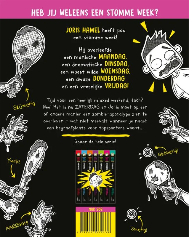 Zaterdag is het zesde deel in de supergrappige graphic-novelserie Stomste week ooit! van Eva Amores en Matt Cosgrove. Ook in het weekend gaat Joris Hamels stomste week verder… Kinderen die van lachen houden zullen deze serie verslinden!<br> <br> Na vijf rampzalige schooldagen breekt de zaterdag eindelijk aan. Joris verheugt zich op een lekker relaxte weekend. Maar helaas! Voor hij het weet belandt hij in een zombie-achtige nachtmerrie… en hij woont naast een kerkhof!<br> <br> Spaar de hele 7-delige serie en op de rug van het omslag verschijnt Joris Hamel.<br> <br> <br> <br> <br> <br>