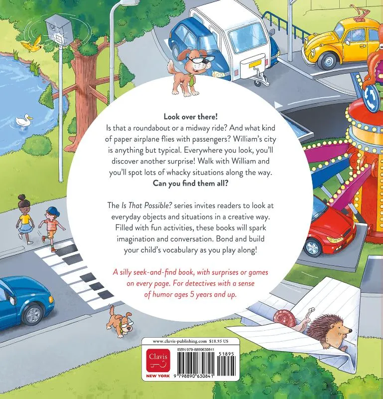 Look over there! Is that a roundabout or a midway ride? And what kind of paper airplane flies with passengers? William’s city is anything but typical. Everywhere you look, you’ll discover another surprise! Walk with William and you’ll spot lots of whacky situations along the way. Can you find them all? The Is That Possible? series invites readers to look at everyday objects and situations in a creative way. Filled with fun activities, these books will spark imagination and conversation. Bond and build your child’s vocabulary as you play along! A silly seek-and-find book, with surprises or games on every page. For detectives with a sense of humor ages 5 years and up.