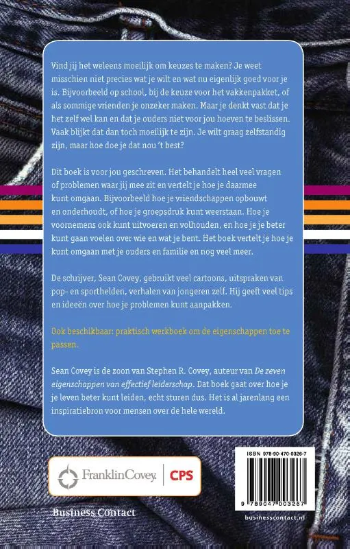 De schrijver, Sean Covey, gebruikt veel cartoons, uitspraken van pop- en sporthelden, verhalen van jongeren zelf. Hij geeft veel tips en ideeën over hoe je problemen kunt aanpakken. Dit boek is vooral voor jou, maar ook je ouders en andere familieleden kunnen er wat van opsteken.Sean Covey is de zoon van Stephen R. Covey, auteur van De zeven eigenschappen van effectief leiderschap. Dat boek gaat over hoe je je leven beter kunt leiden, echt sturen dus. Het is al jarenlang een inspiratiebron.