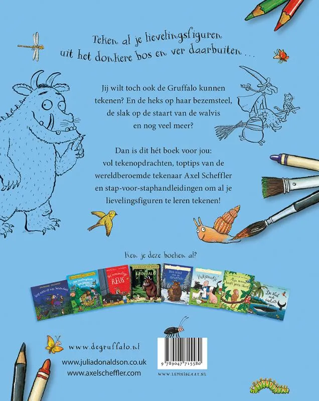 Ontdek hoe leuk het is om de Gruffalo, de Heks en Rinus de rommelige reus te tekenen. Dankzij de toptips van Axel Scheffler over gezichtsuitdrukkingen, hoe je beweging kunt laten zien, wat kleuren voor verschil maken en nog veel meer, komen je creaties echt tot leven!