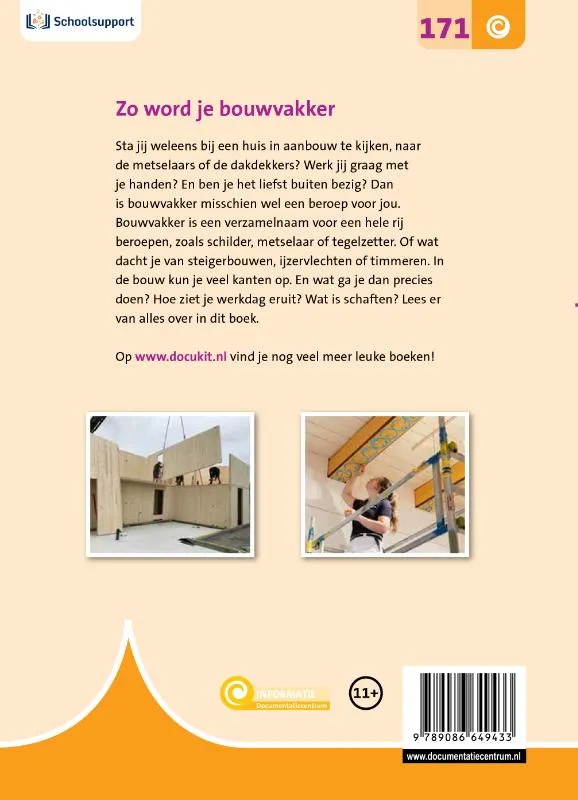 Sta jij weleens bij een huis in aanbouw te kijken, naar de metselaars of de dakdekkers? Werk jij graag met je handen? En ben je het liefst buiten bezig? Dan is bouwvakker misschien wel een beroep voor jou. Bouwvakker is een verzamelnaam voor een hele rij beroepen, zoals schilder, metselaar of tegelzetter. Of wat dacht je van steigerbouwen, ijzervlechten of timmeren. In de bouw kun je veel kanten op. En wat ga je dan precies doen? Hoe ziet je werkdag eruit? Wat is schaften? Lees er alles over in dit boek.