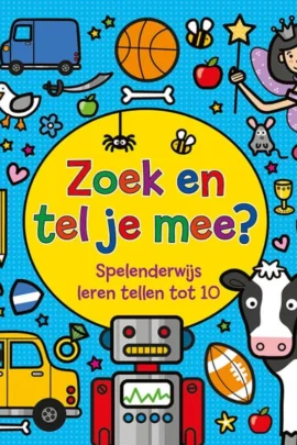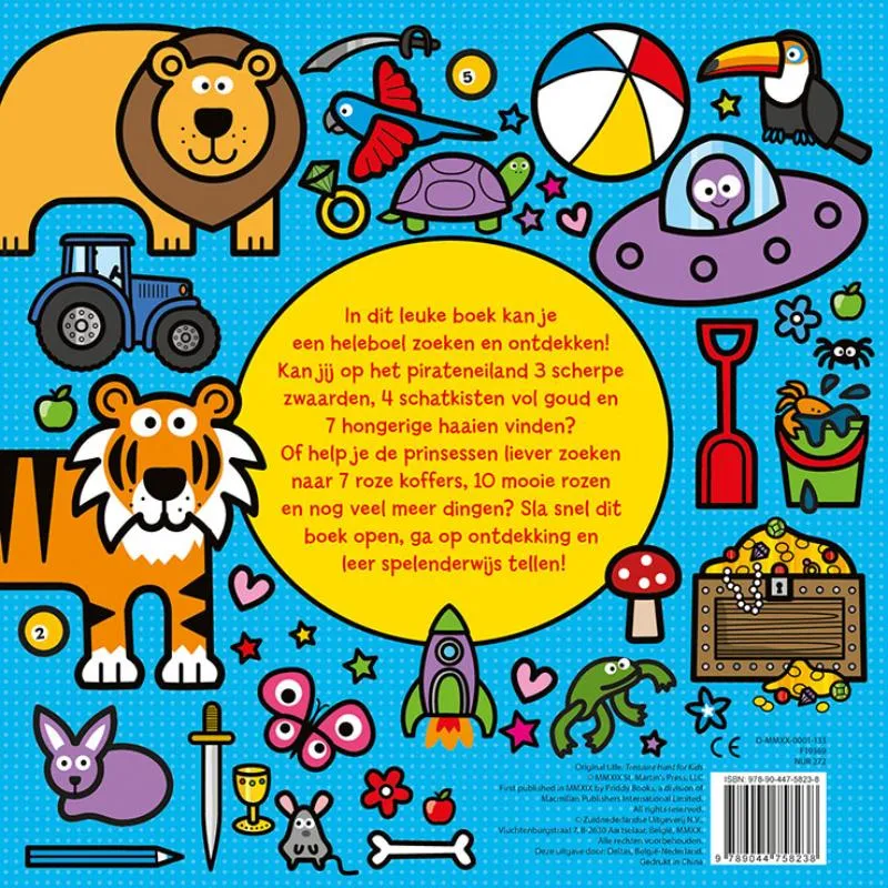 In dit leuke boek kan je een heleboel zoeken en ontdekken! Kan jij op het pirateneiland 3 scherpe zwaarden, 4 schatkisten vol goud en 7 hongerige haaien vinden? Of help je de prinsessen liever zoeken naar 7 roze koffers, 10 mooie rozen en nog veel meer dingen? Sla snel dit boek open, ga op ontdekking en leer spelenderwijs tellen!