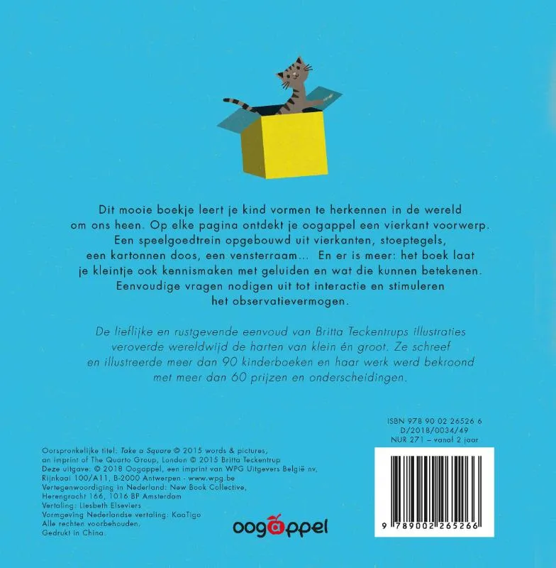 Dit mooie boekje leert je kind vormen te herkennen in de wereld om ons heen. Op elke pagina ontdekt je oogappel een vierkant voorwerp. Een speelgoedtrein opgebouwd uit vierkanten, stoeptegels, een kartonnen doos, een vensterraam… En er is meer: het boek laat je kleintje ook kennismaken met geluiden en wat die kunnen betekenen. Eenvoudige vragen nodigen uit tot interactie en stimuleren het observatievermogen.