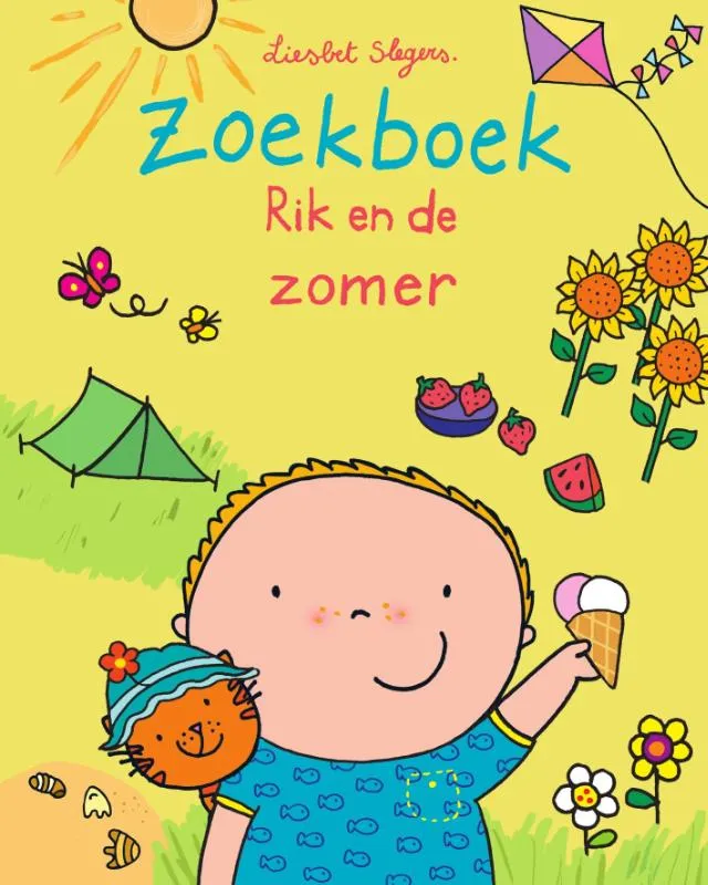Wat is de zomer een heerlijk seizoen! Rik houdt van de zomer, met zijn zoemende bijen, sappige kersen en… lekker zoete ijsjes! Ga je mee met Rik schelpjes zoeken op het strand, plonzen in het zwembad en aardbeien plukken? Ook Sam de poes is dol op de zomer. Zoek je mee naar Sam de poes tussen zonnebloemen, zandkastelen en tomatenplantjes? En vind jij ook Riks zonnebril, zijn zwembroek en de zonnecrème? Tekst en illustraties: Liesbet Slegers