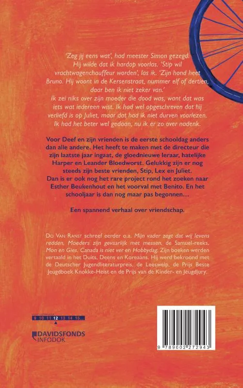 Zoeken naar Esther B en het voorval met Benito Voor Deef en zijn vrienden is de eerste schooldag anders dan alle andere. Het heeft te maken met de directeur die zijn laatste jaar ingaat, de gloednieuwe leraar, hatelijke Harper en Leander Bloedworst. Gelukkig zijn er nog steeds zijn beste vrienden, Stip, Lex en Juliet. Dan is er ook nog het rare project rond het zoeken naar Esther Beukenhout en het voorval met Benito. En het schooljaar is dan nog maar pas begonnen… Een spannend verhaal over vriendschap.