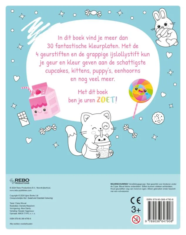 In dit boek vind je meer dan 30 fantastische kleurplaten. Met de 4 geurstiften en de grappige ijslollystift kun je geur en kleur geven aan de schattigste cupcakes, kittens, puppy’s, eenhoorns en nog veel meer. Met dit boek ben je uren zoet!