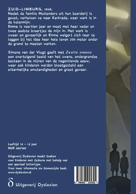 ZUID-LIMBURG, 1845. Nadat de familie Mullenders uit hun boerderij is gezet, verhuizen ze naar Kerkrade, waar werk is in de kolenmijn. Emma is veertien jaar en moet met haar vader en twee oudste broertjes de mijn in. Het werk is zwaar en gevaarlijk en Emma weigert zich neer te leggen bij het idee haar hele leven 200 meter onder de grond te moeten werken. Simone van der Vlugt geeft met Zwarte sneeuw een overtuigend beeld van het zware, ondergrondse bestaan in de mijnen van de negentiende eeuw, waar ook kinderen werden blootgesteld aan erbarmelijke omstandigheden en groot gevaar.